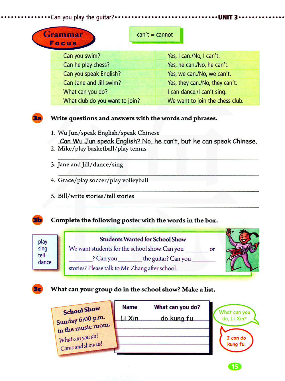 你会做什么?我会跳舞。我不会唱歌。你们想参加什么俱乐部?我们想参加象棋俱乐部。