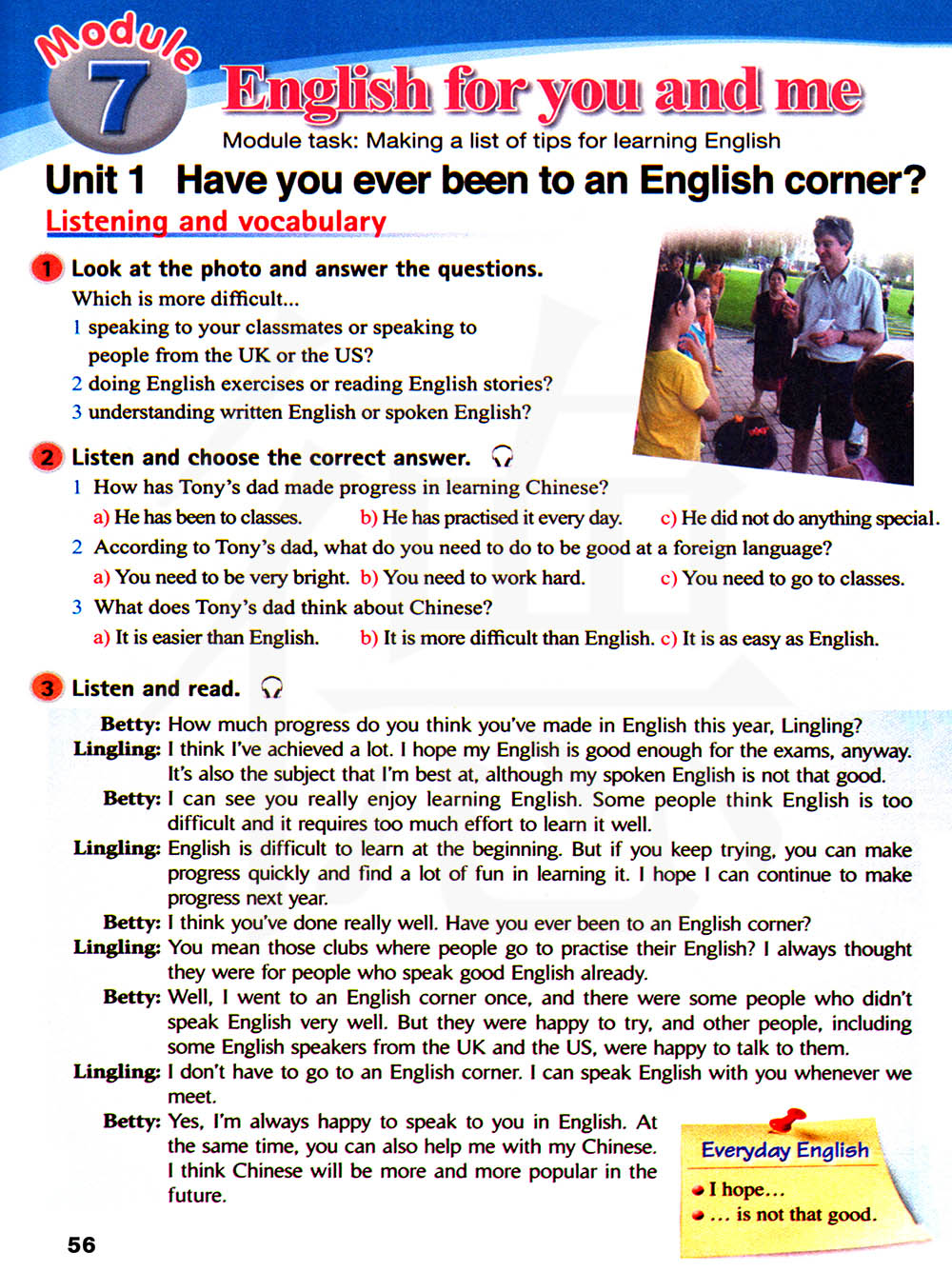 嗯,我去过一次英语角,有一些人英语说得不是很好。但他们很乐意尝试,还有其他人,包括一些来自英国和美国的说英语的人,都很乐意和他们交谈。我不必去英语角,任何时候我们碰面了,我都可以和你说英语。