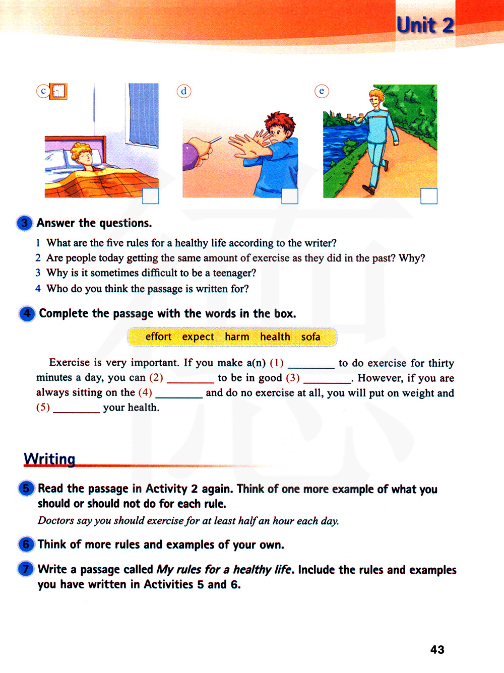 写一篇名为《我的健康生活准则》的短文,包括你在活动5和6中所写的准则和例子。