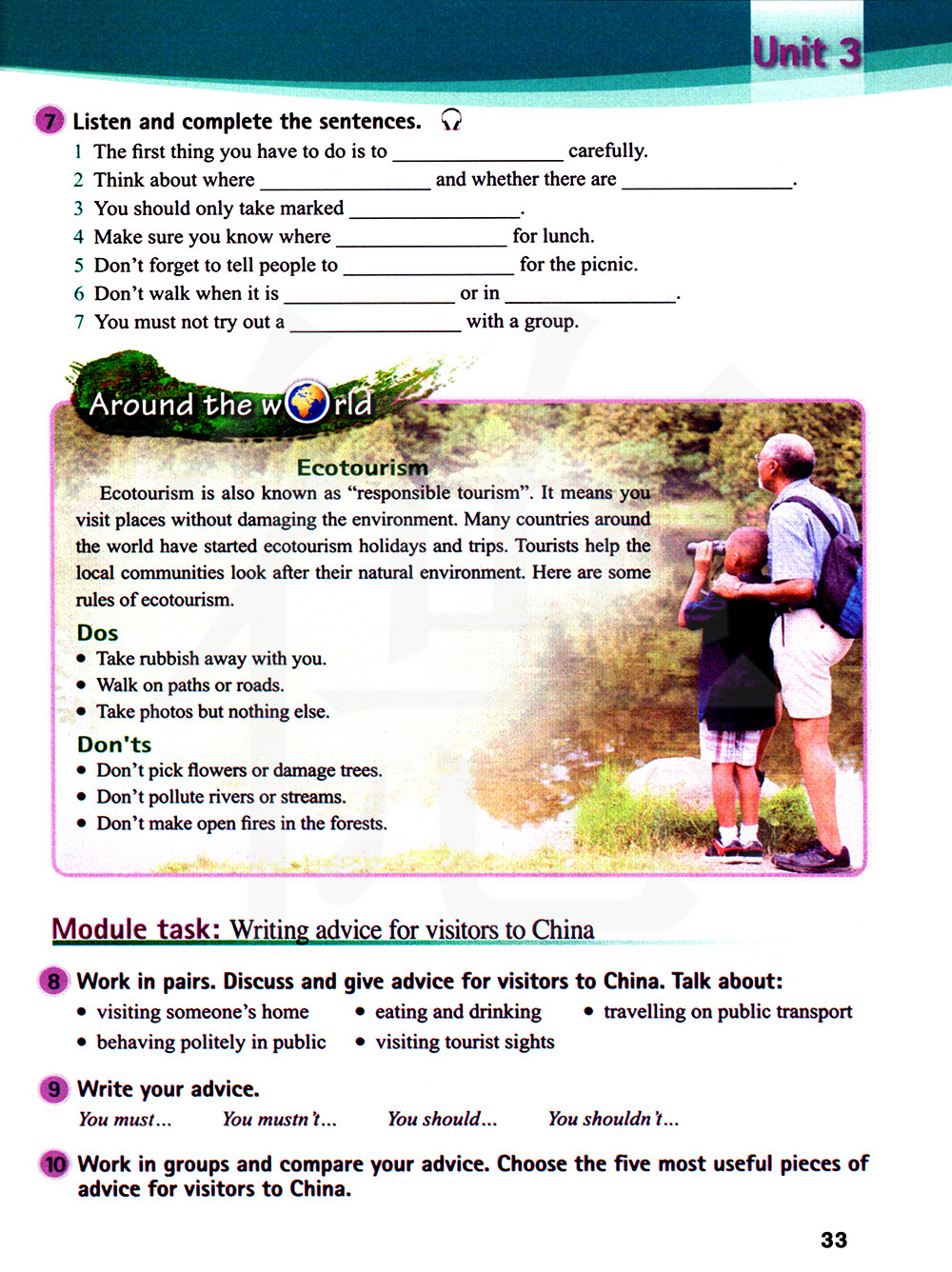 生态旅游也被称为“负责任的旅游”。这意味着你游览的地方不会破坏环境。世界上许多国家已经开始了生态旅游假期和旅行,游客帮助当地社区照顾他们的自然环境。