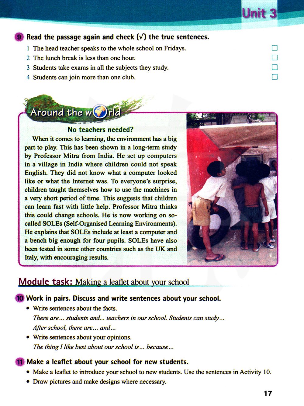 给新生制作一张传单来介绍学校,使用活动10中的句子。必要时画一些画并做些设计。