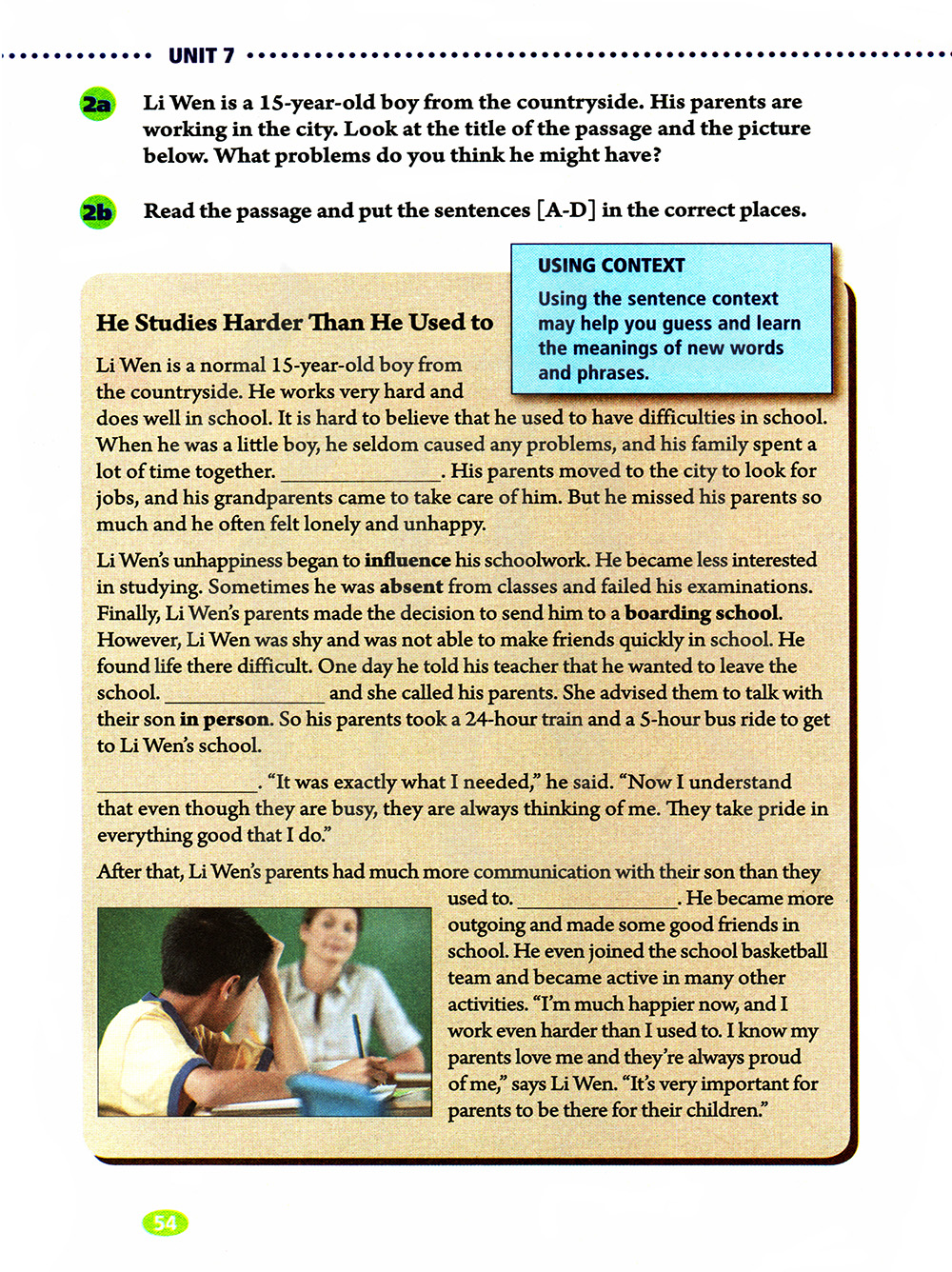 李文是一个来自乡下的15岁男孩。他的父母在城里工作。看看这篇文章的标题和下面的图片。你认为他可能有什么问题?