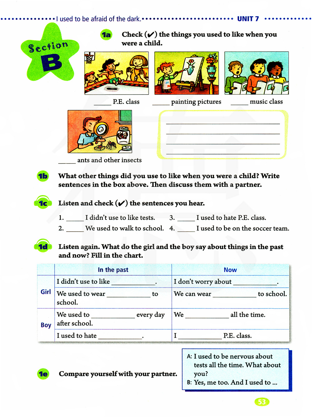 当你还是小孩的时候,你还喜欢其他什么事情?在上面的框中写下句子,然后与同伴讨论。