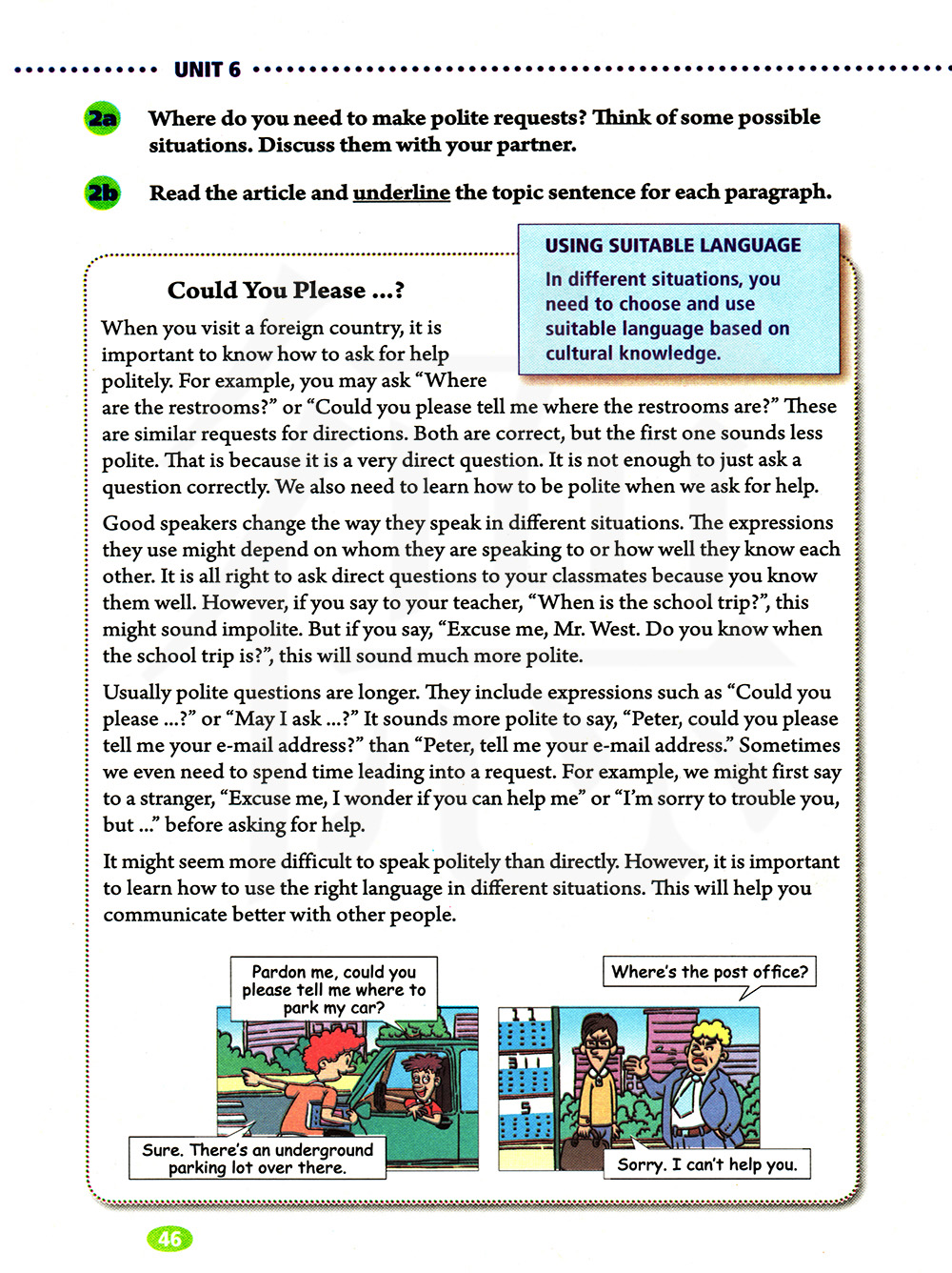 会说话的人可以在不同场合使用不同的说话方式。他们采用哪种表达方式取决于他们说话的对象或与对方熟识的程度。比如和你的同学说话时,采用直接问法是没问题的,因为你很了解他们。然而,如果你和你的老师说:“学校旅行是什么时候?“这听上去可能就不太礼貌。但是如果你说”打扰一下,韦斯特老师。你知道学校旅行是什么时候吗?“ 这就听起来礼貌了很多。