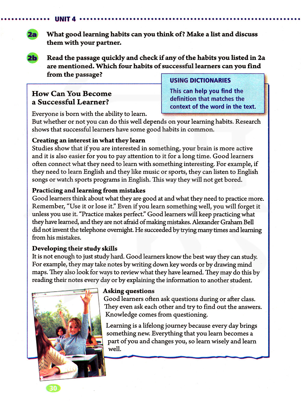 快速阅读文章。核对你在2a中列出的习惯是否有提到。你能从这篇文章中找到成功学习者的四个习惯?