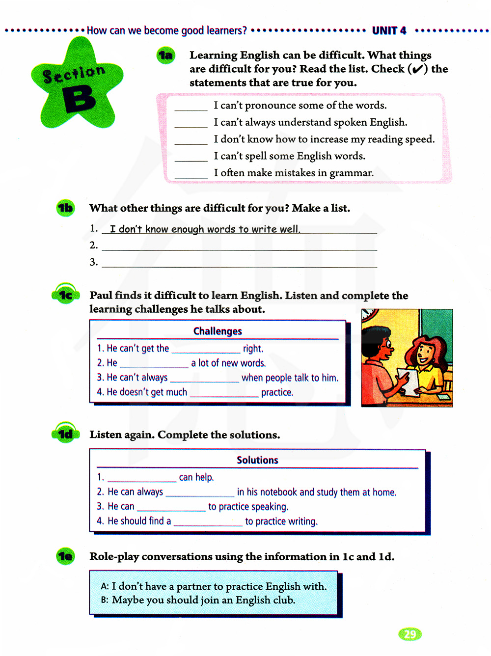 保罗发现学英语很难。倾听并完成他所说的学习挑战。