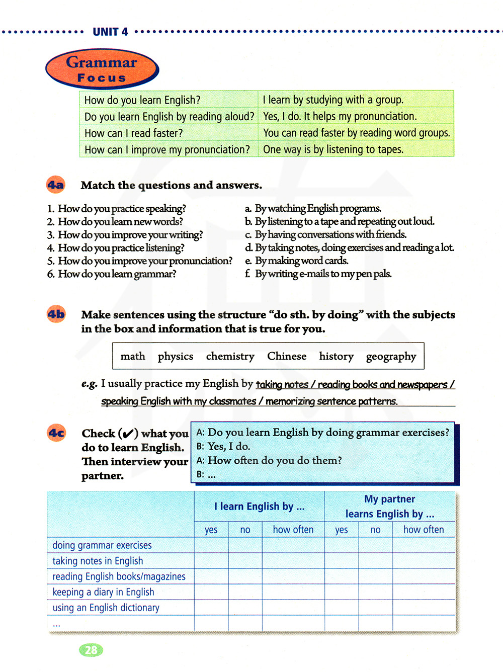 你如何提高你的写作?通过和朋友进行对话。你如何练习听力?通过做笔记,做练习和多阅读。