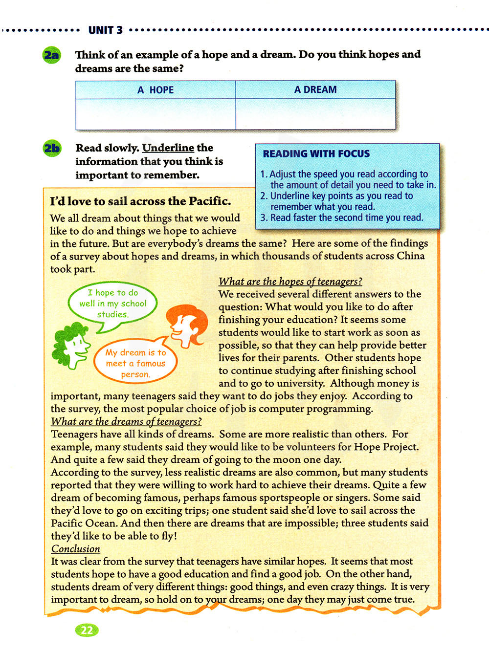 调查很明显表示,青少年都有类似的希望。看上去大多数学生都希望获得良好的教育并找到一份好工作。另一方面,学生的梦想迥异:好东西,甚至疯狂的事。有梦想很重要,所以要坚持你的梦想,有一天梦想终会成真。