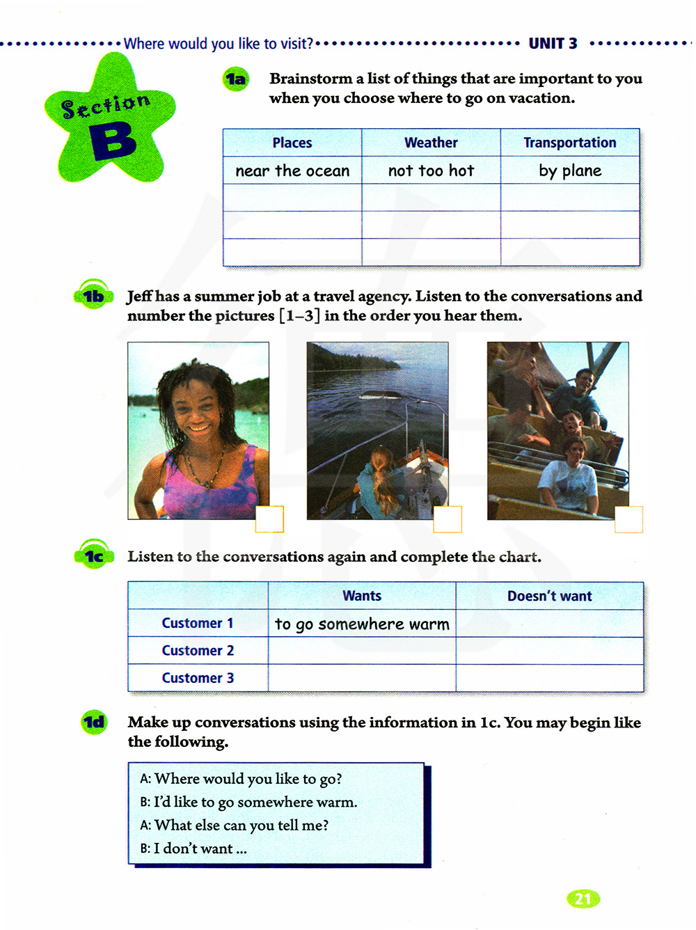 杰夫在旅行社打暑假工。听对话并按听到的顺序给图片编号[1-3]。