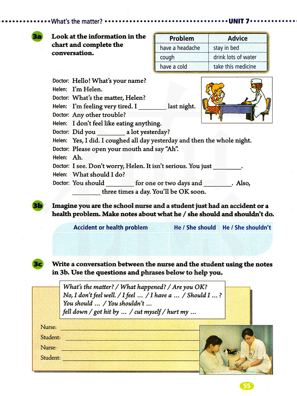 用3b中的笔记写一写护士和学生间的对话。用下面的问题和词组来帮助你。