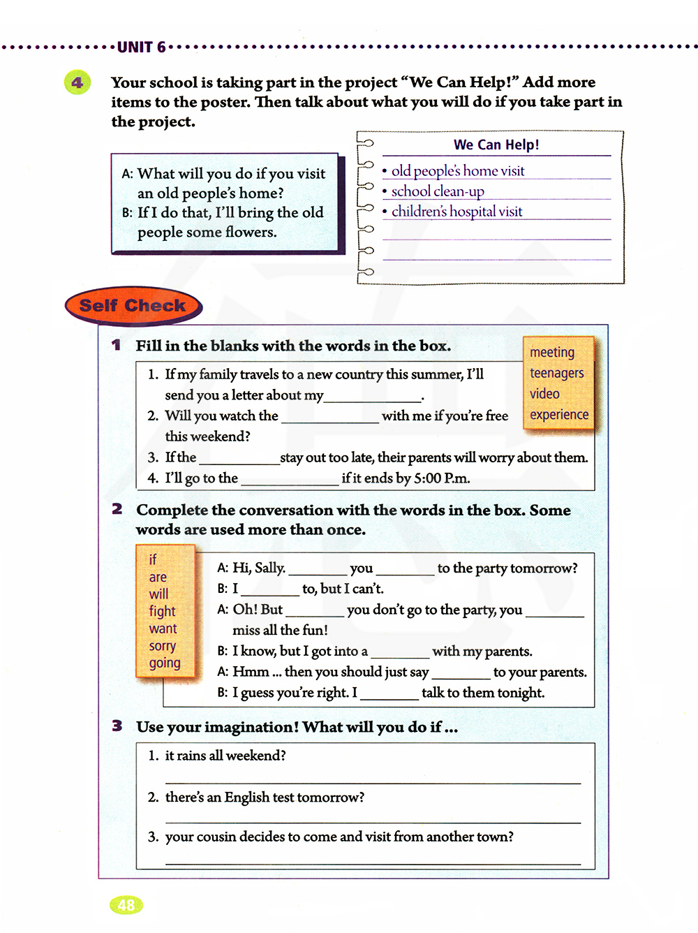 你的学校正在参加“我们能帮助”项目。添加更多项目到这张海报上。然后谈论如果你参加这个项目,你将会做什么?