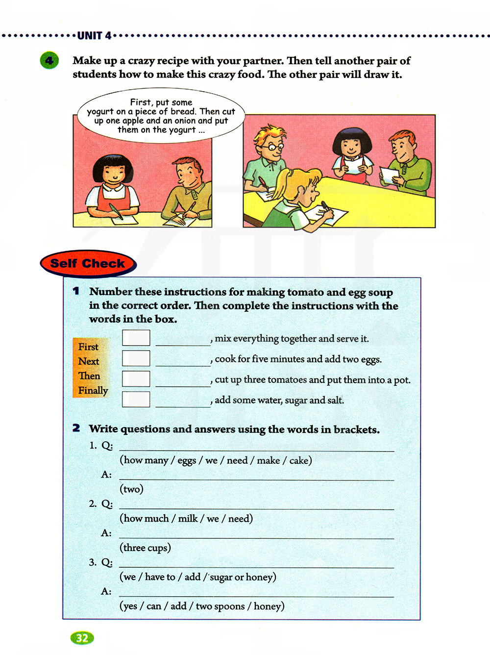 与你的伙伴编一个疯狂的食谱。然后告诉另一个学生如何去制作这一道疯狂的食物,另一对将把它画出来。