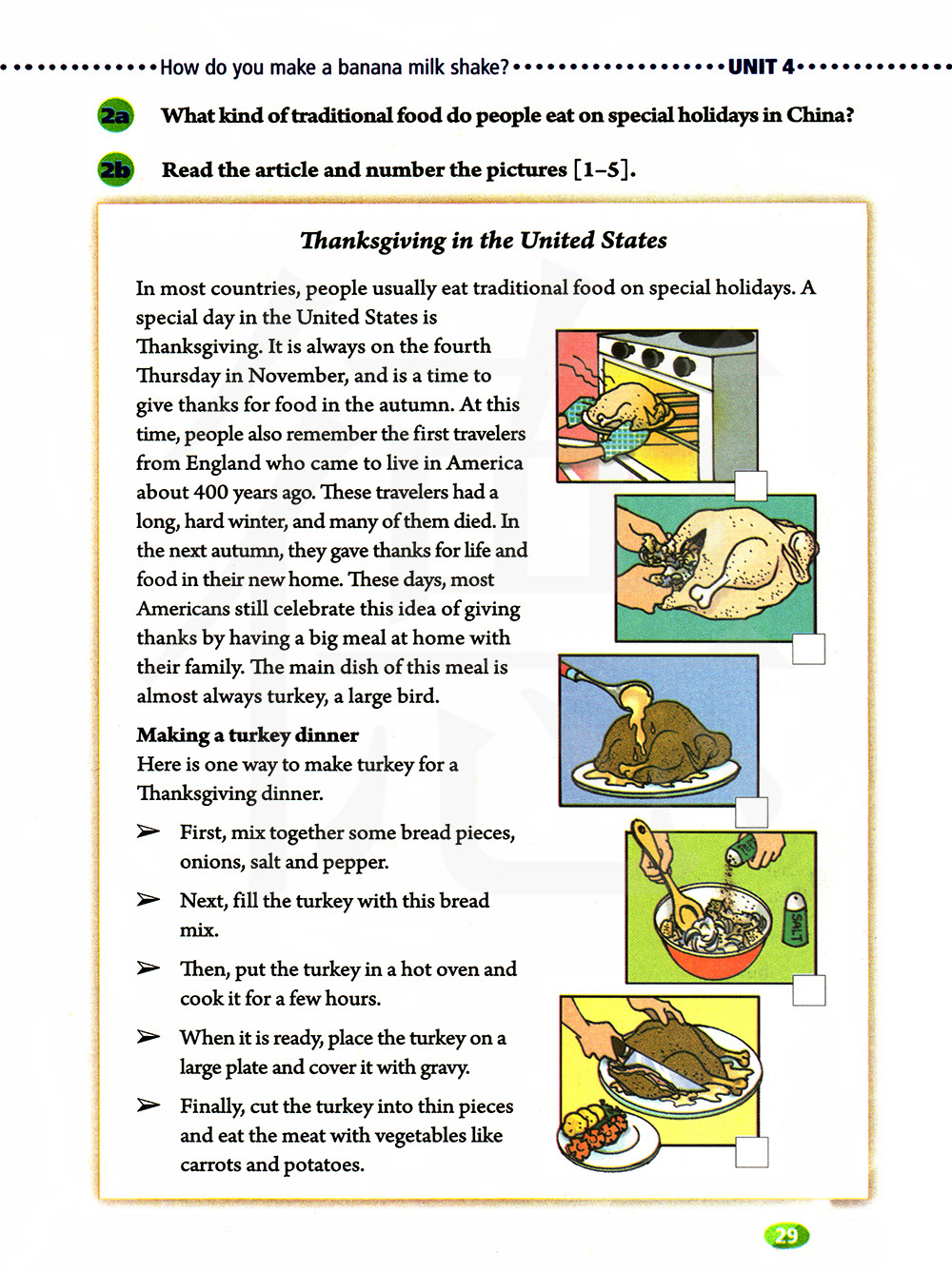 在大多数国家,人们通常在特殊的节日吃传统食物。在美国有一个特殊的日子,感恩节。它总是在11月的第四个星期四,也是秋天感谢食物的时候。在这个时候,人们还记得大约400年前第一批从英国来到美国的旅行者。这些旅行者度过了一个漫长而艰难的冬天,其中很多人都死了。第二年秋天,它们为新家的生活和食物感恩。如今,大多数美国人仍然通过和家人在家里吃一顿大餐来庆祝感恩节。这顿饭的主材几乎总是火鸡,一种大鸟。