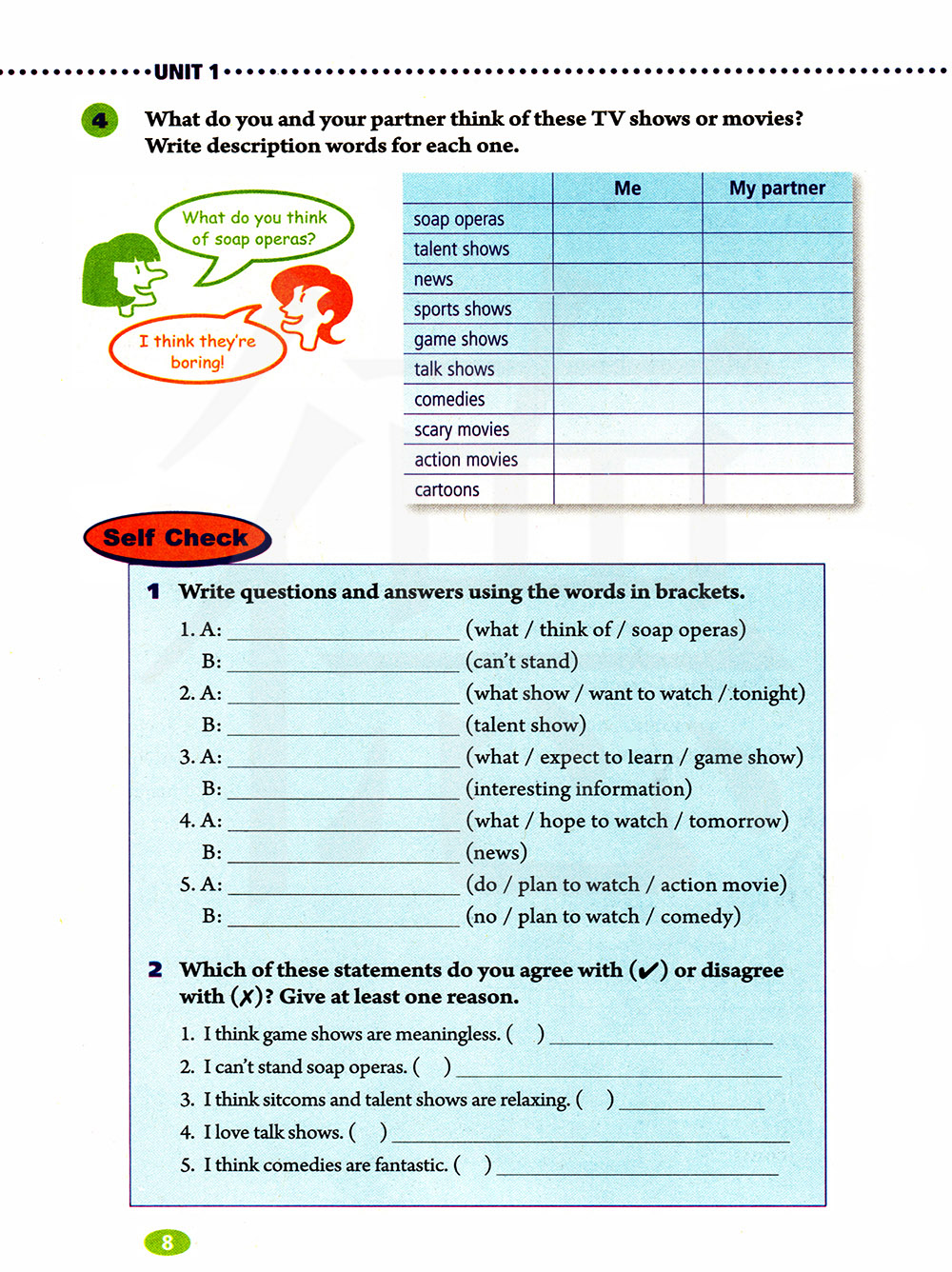 你和你的伙伴认为这些电视节目或电影怎么样?为每一个写描述性词语。