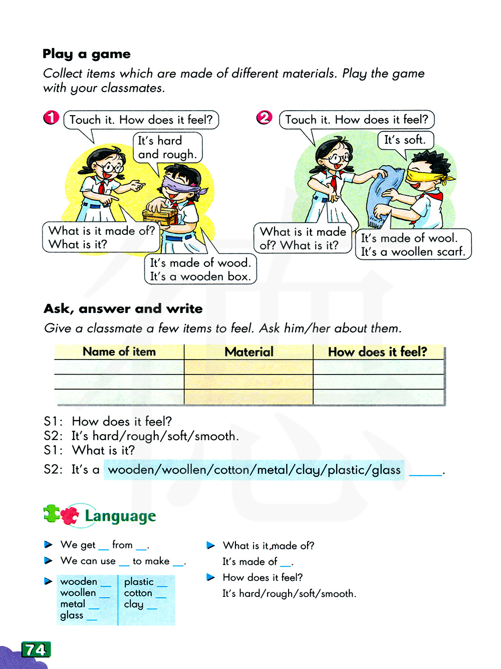 收集一些用不同材料做成的东西。和你同学一起做游戏。