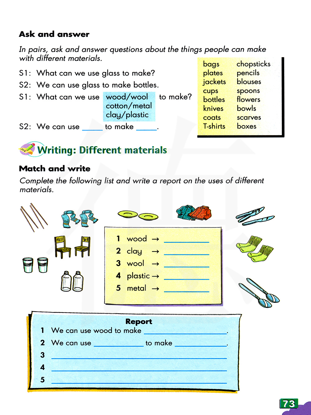 我们可以用木材/羊毛做什么?我们可以用棉花/金属来制作什么? 我们可以用黏土/塑料来制作什么?