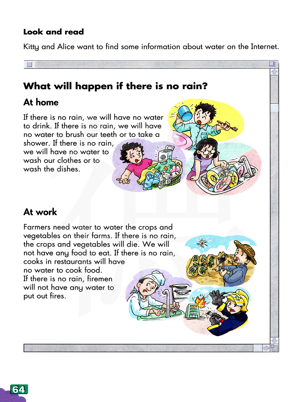 如果没有雨的话,我们就会没有水喝。如果没有雨的话,我们就会没有水刷牙或洗澡。如果没有雨的话,我们就会没有水洗衣服或洗餐具。