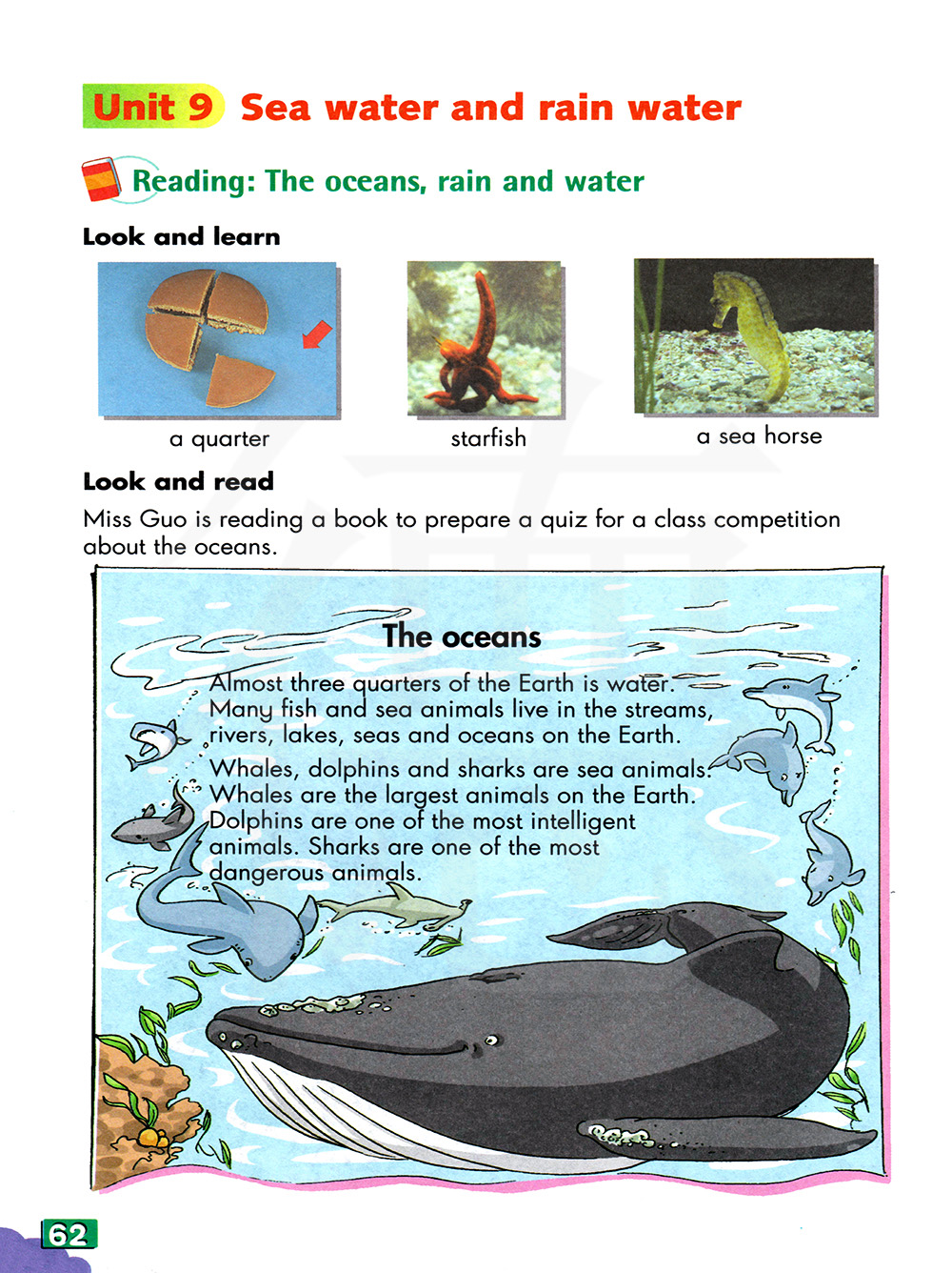 地球表面约四分之三都是水。许多鱼和海生动物生活在地球上地小溪,河流,湖泊和海洋里。