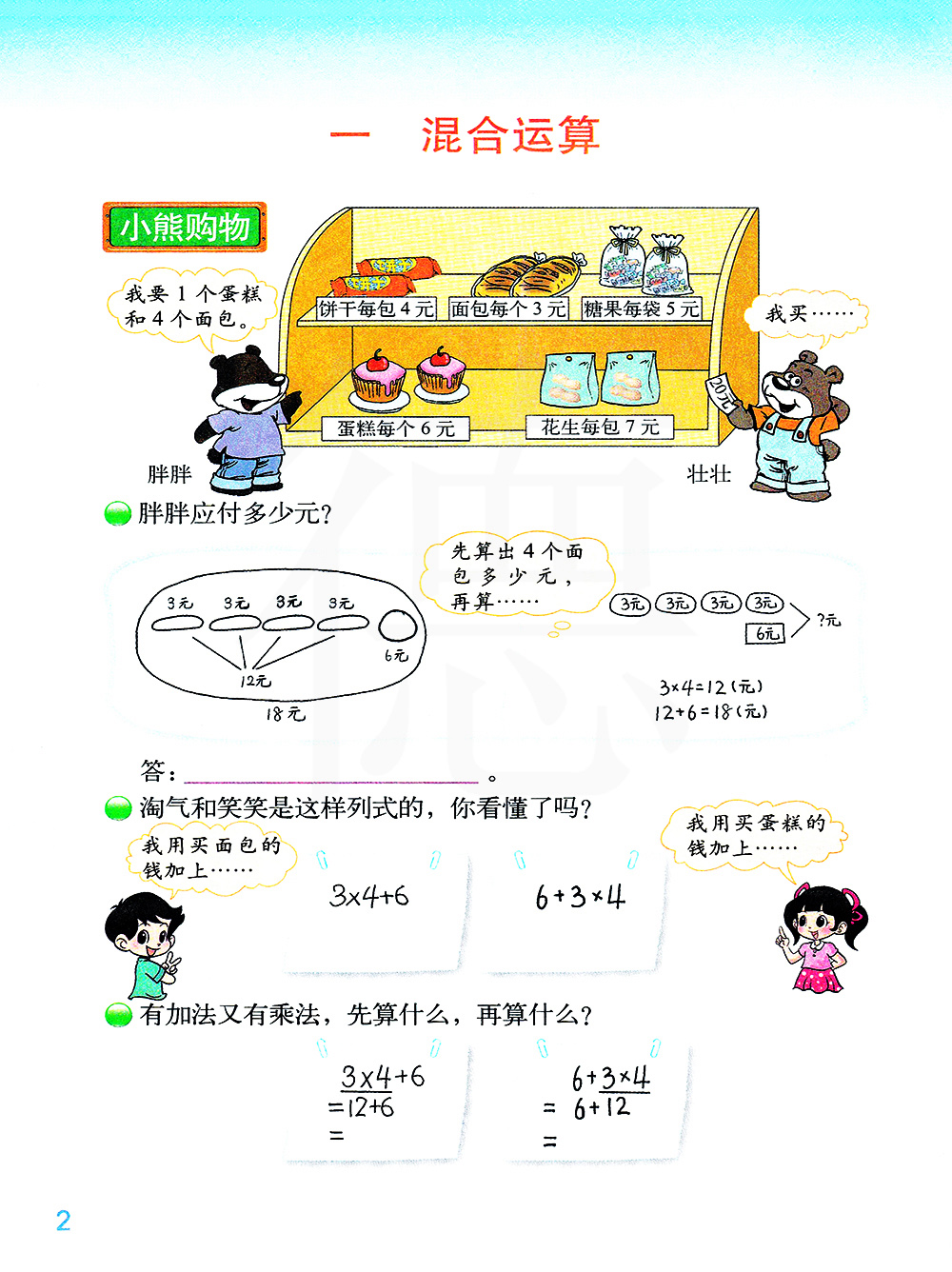 2、在没有括号的算式里,如果只有加、减法或者只有乘、除法,都要从左往右按顺序计算。