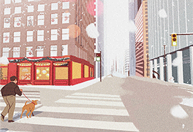 咖啡馆就在那边马路对面。