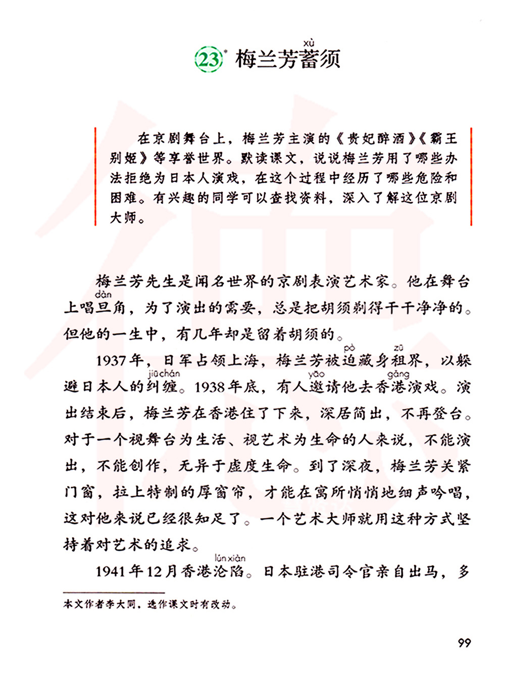 3、初步感知课文的内容,感受梅兰芳高尚的爱国情感和坚定的民族气节。