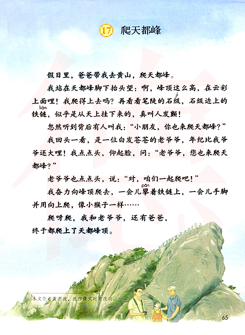 1、认识“陡、链”等6个生字。会写“爬、峰”等11个生字。2、正确、流利、有感情地朗读课文,重点读好对话,读出不同人物的语气和心情。3、了解课文的主要内容,体会“我”和老爷爷如何在相互鼓舞下,坚定信心战胜困难的过程。4、能过课件感受天都峰的“又高又陡”,从而体会小姑娘和老爷爷爬山前的心理活动;通过朗读学习并讨论了解爬山的过程是培养战胜困难的勇气和信心,在与人相处的过程中,善于互相学习,互相鼓励,共同进步。5、懂得善于从别人身上汲取力量,培养学生从小不怕困难、奋发向上的品格。