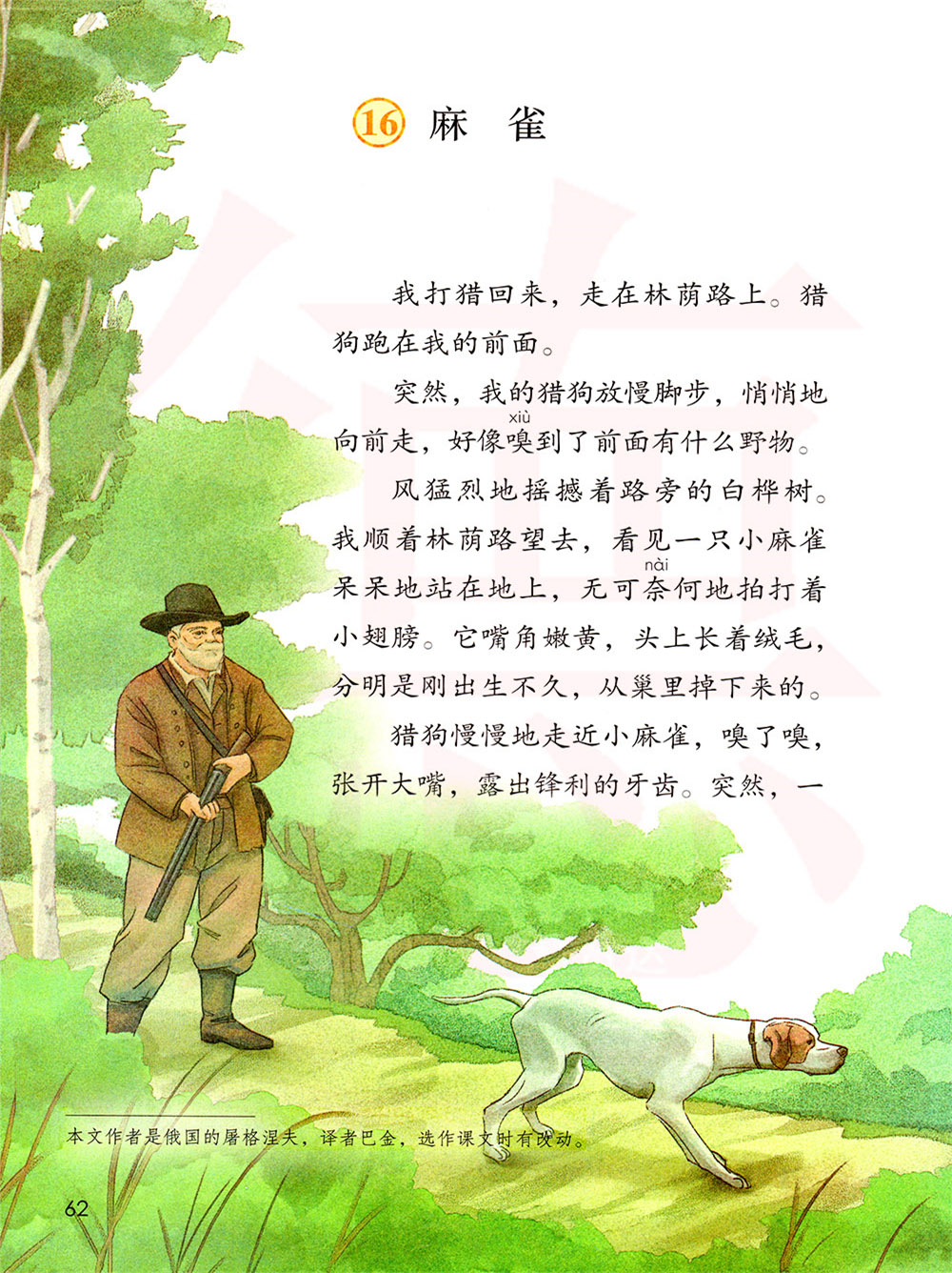 3、有感情地读课文,想画面,体会老麻雀对小麻雀的那样伟大的、无与伦比的爱,从而受到爱弱小者,同情弱小者,见义勇为的熏陶。 教学重点和难点 抓重点句子,想画面,体会作者是怎样通过具体描写来表现麻雀奋不顾身掩护小麻雀的那种精神。