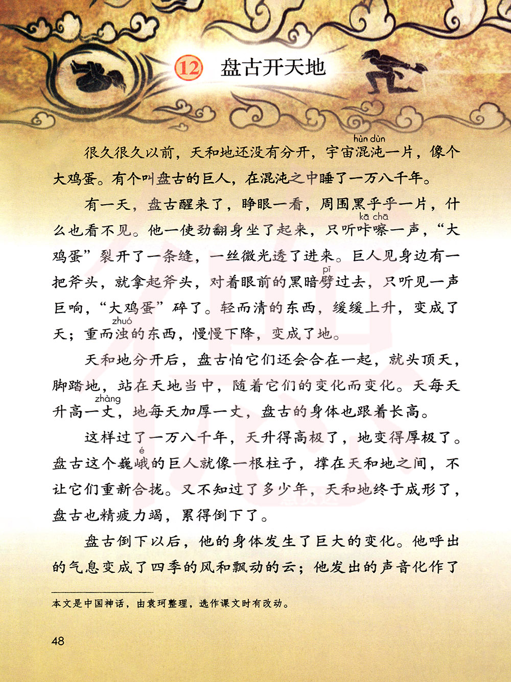 2.正确、流利、有感情地朗读课文,感受盘古高大英勇的形象,体会盘古勇于献身的精神,从中受到祖国传统文化的精神滋养。