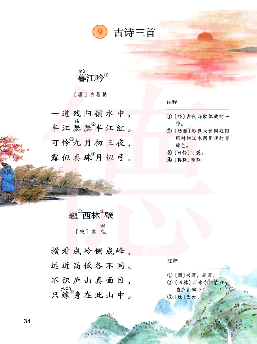 注释:⑴暮江吟:黄昏时分在江边所作的诗。吟,古代诗歌的一种形式。