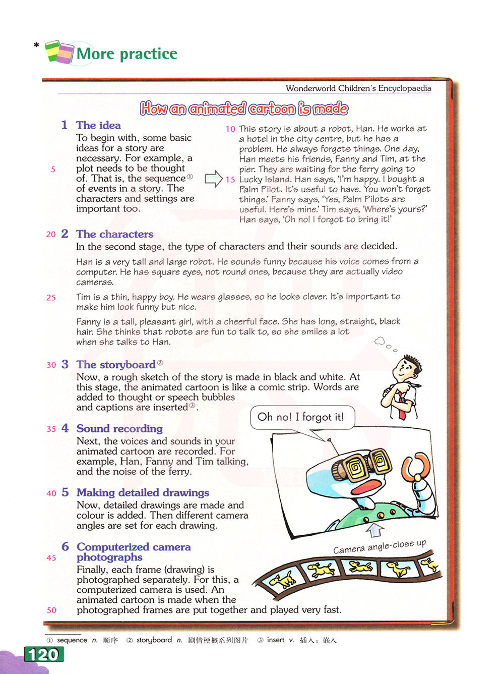 这是一个关于叫汉的机器人的故事。他在市中心的一个旅店工作,但是他有一个问题,他总是忘事。一天,汉在码头与他的朋友们,芬妮和提姆见面。他们在等到幸运岛上的轮渡。汉说,:“我很开心,我买了一个掌上导航器,它很有用。”你不会忘记事情。芬妮说:“是的,掌上导航器很有用,这是我的”。提姆说,“你的呢?”汉说,“噢不,我忘记带它了。”