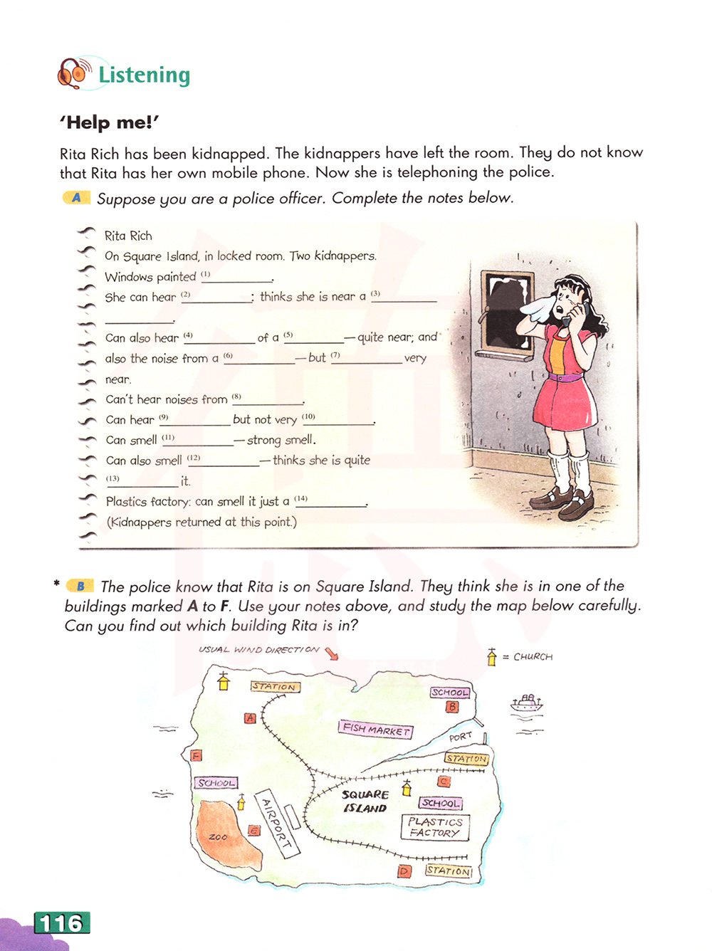 警察直达丽塔在方形小岛上。他们认为她在标记为A到F中的一栋建筑里。运用你上面的笔记,仔细的研究下面的地图。你能找到丽塔在哪一栋建筑里吗?
