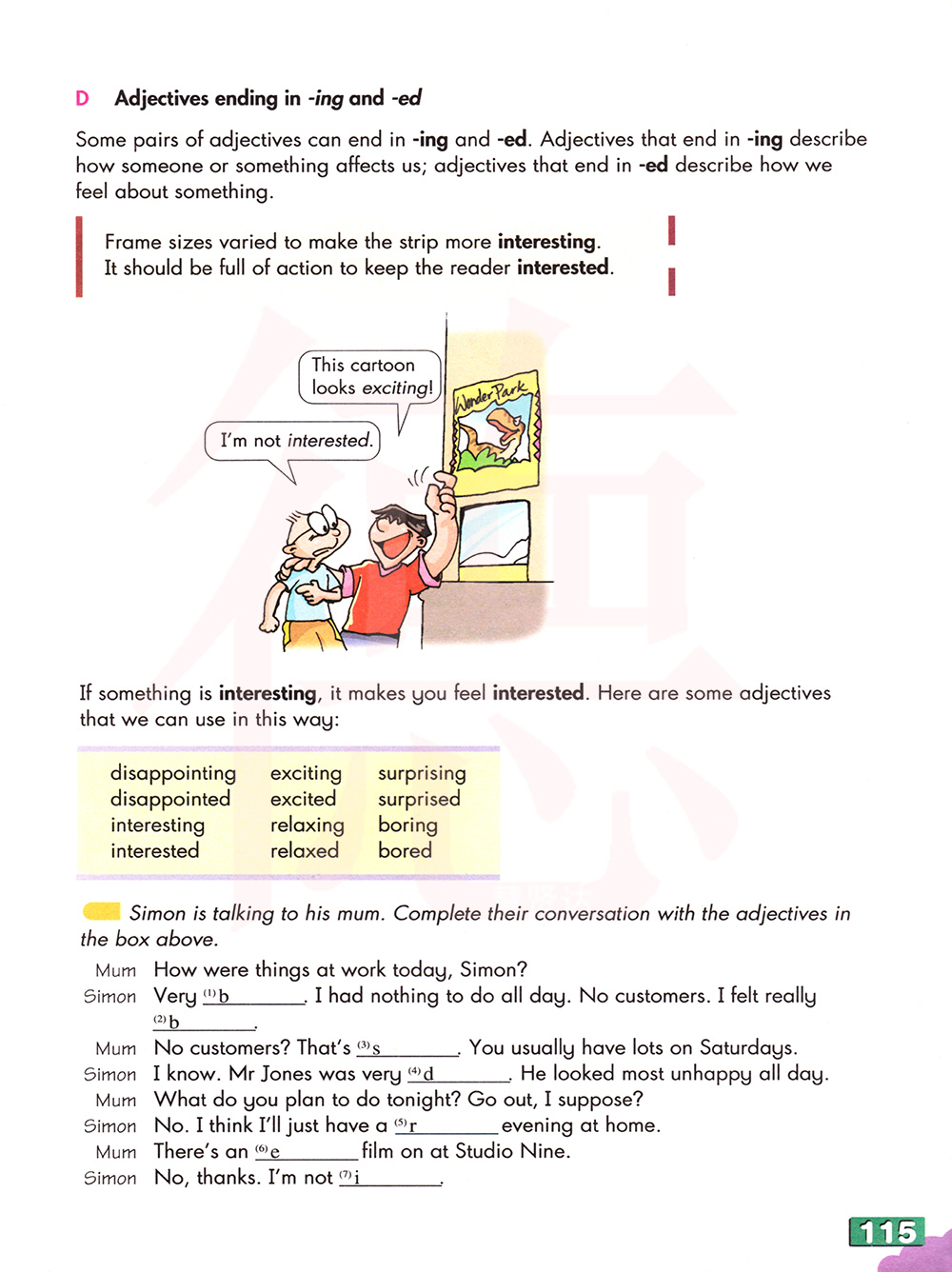西蒙在和他的妈妈说话。用上面方框里的形容词完成他们的对话。