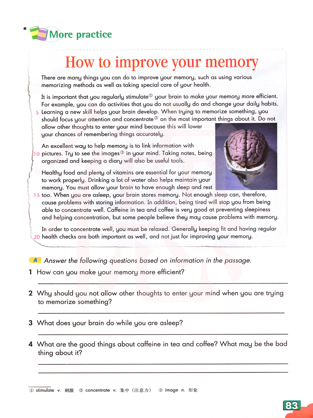 有规律地刺激你的大脑让你的记忆更加有效是很重要的。例如,你可以做你补偿做得事情,并且改变你日常的习惯。学习一种新技能帮助你的大脑开发。当试着记某事时,你应该聚集你的注意力并集中在关于它的重要的事物。不允许其他的想法进入你的脑海因为这样会降低你准确记住事物的几率。