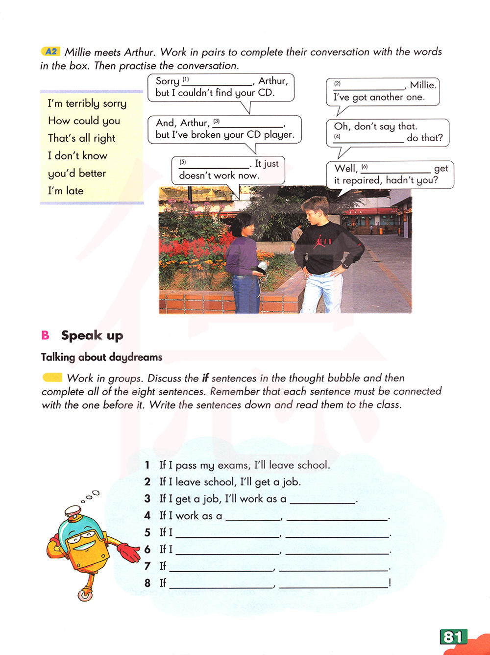 米莉遇见了亚瑟。两人一组用方框里的词语完成他们的对话。然后练习对话。