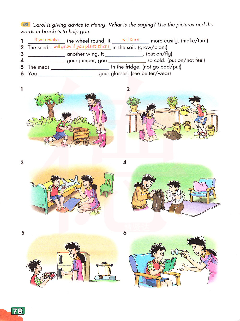 卡罗尔在给亨利提建议。她说了什么?使用这些图片和括号里的单词来帮助你。