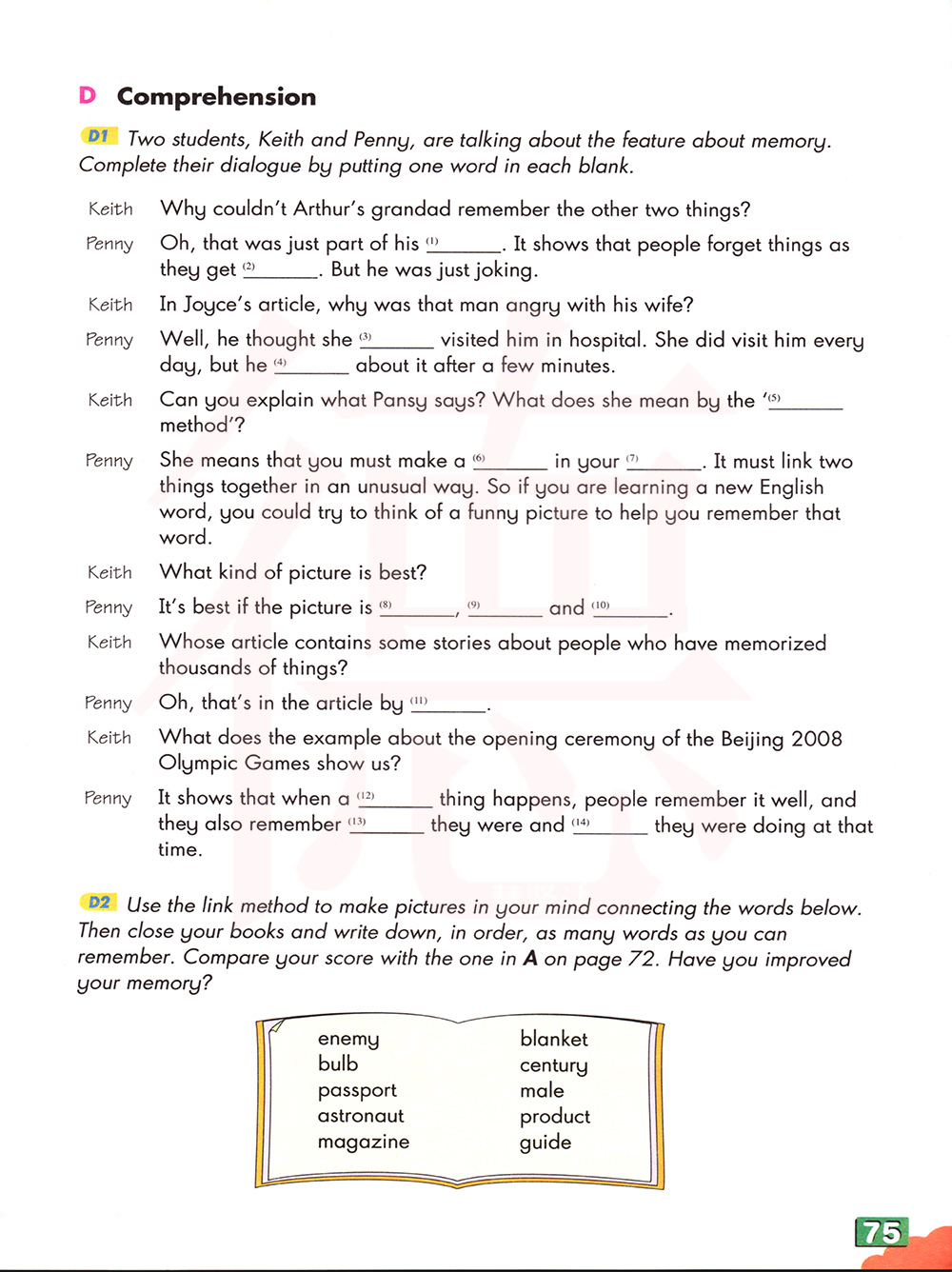 两个学生,基思和彭妮在谈论记忆的特征。一空填一词完成他们的对话。