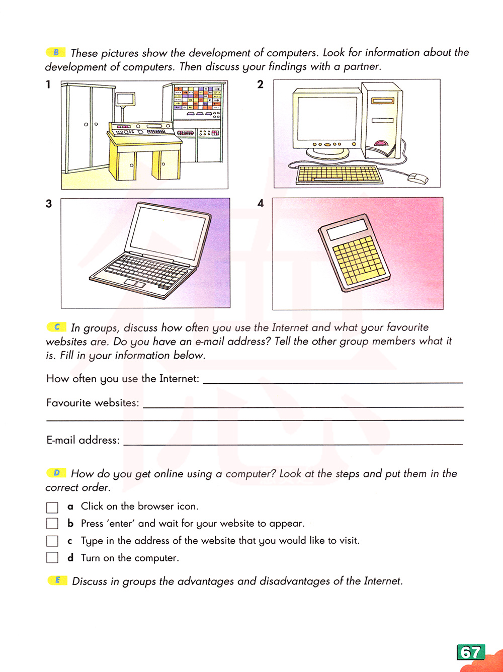 这些图片展示了计算机的发展。看有关计算机发展的信息。然后和一个搭档讨论你的发现。