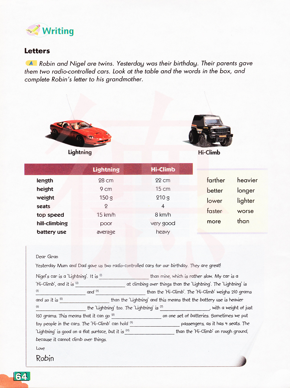 罗宾和奈杰尔是一对双胞胎。昨天是他们的生日。他们的父母给他们两部无线电控制的小汽车。看一看表格和方框中的单词,完成罗宾写给他祖母的信。