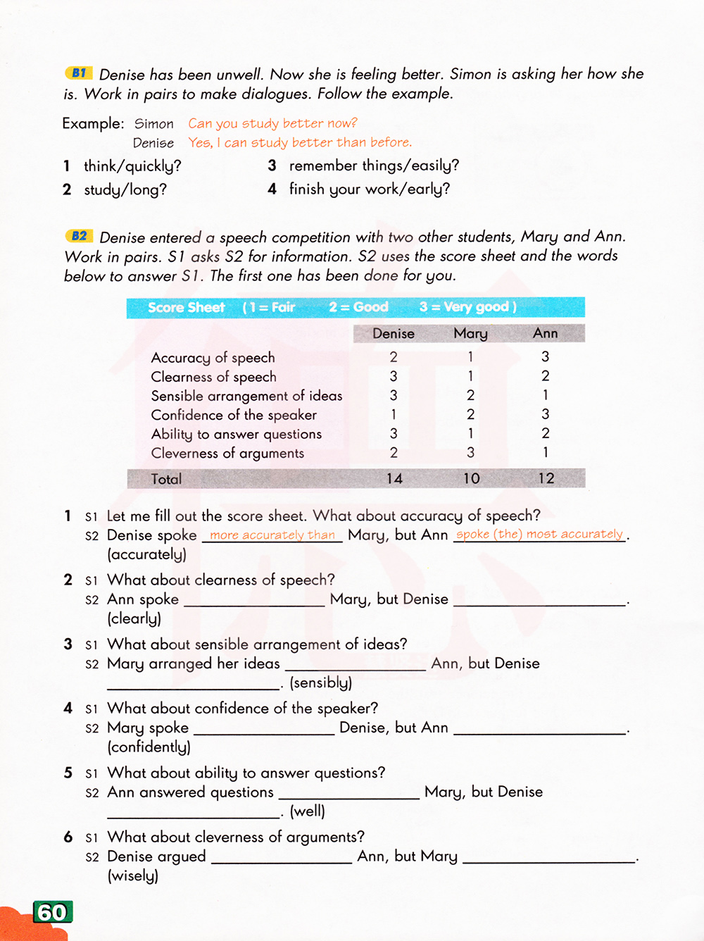 丹尼斯和其他两名同学,玛丽和安参加了演讲比赛。结对练习。学生一问学生二有关信息。学生二用下面的分数表和单词回答学生一的问题。第一个已经做好了。