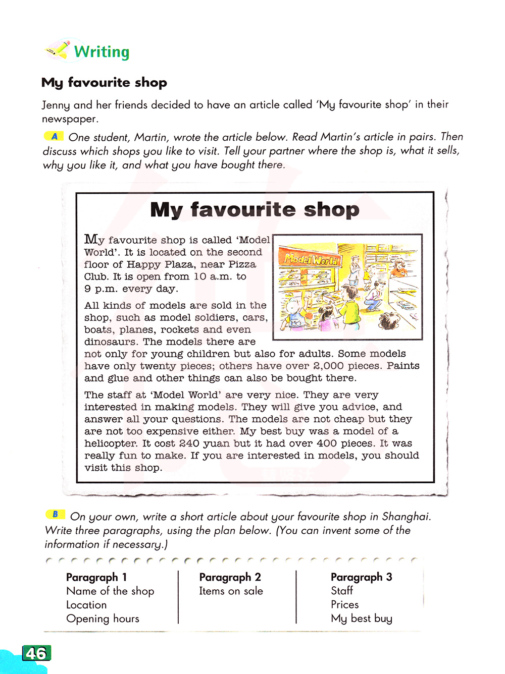 一个学生,马丁,写了下面的文章。结对阅读马丁的文章。然后讨论你们喜欢去参观的商店是哪些。告诉你们的同伴商店在哪儿,都卖什么,你为什么喜欢它,你在那里买了什么。
