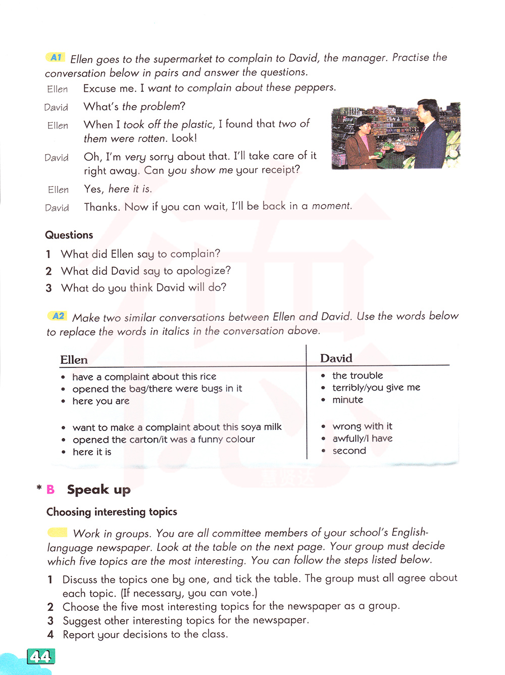 埃伦去超市向经理大卫投诉。结对练习下面的对话并回答问题。