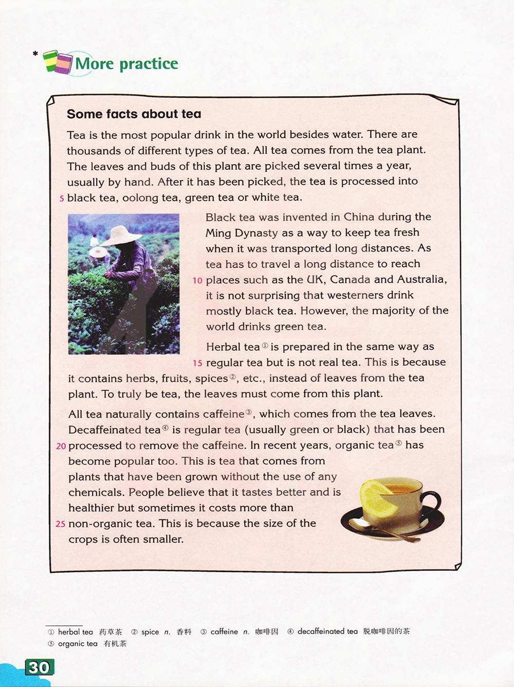茶是除了水之外的世界上最受欢迎的饮料。有数千种不同种类的茶。所有的茶都是来自于茶树。茶树的叶子和芽每年都会被采摘好几次,通常都是人工采的。采下茶叶后,它们就被加工成红茶,乌龙茶,绿茶或者是白茶。