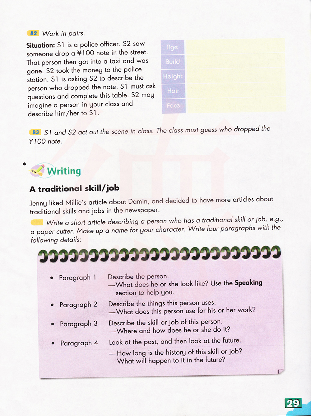 情景一:学生一是一个警官。学生二看见有人在街上掉了一张100元的钞票。那个人坐上出租车走了。学生二把钱交到警察局,学生一让学生二描述掉钱的那个人。学生一必须询问一些问题,然后完成表格。学生二可以想象你们班上的一位同学是掉钱的那个人,并向学生一描述。