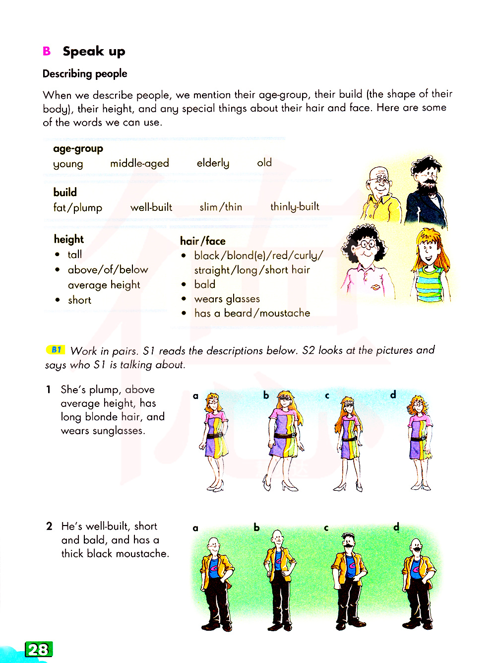当我们描述人物的时候,我们会提到他们的年龄段。身材(身型),他们的身高和他们的头发,脸上的一些特别之处。这里有一些我们可以使用的词。