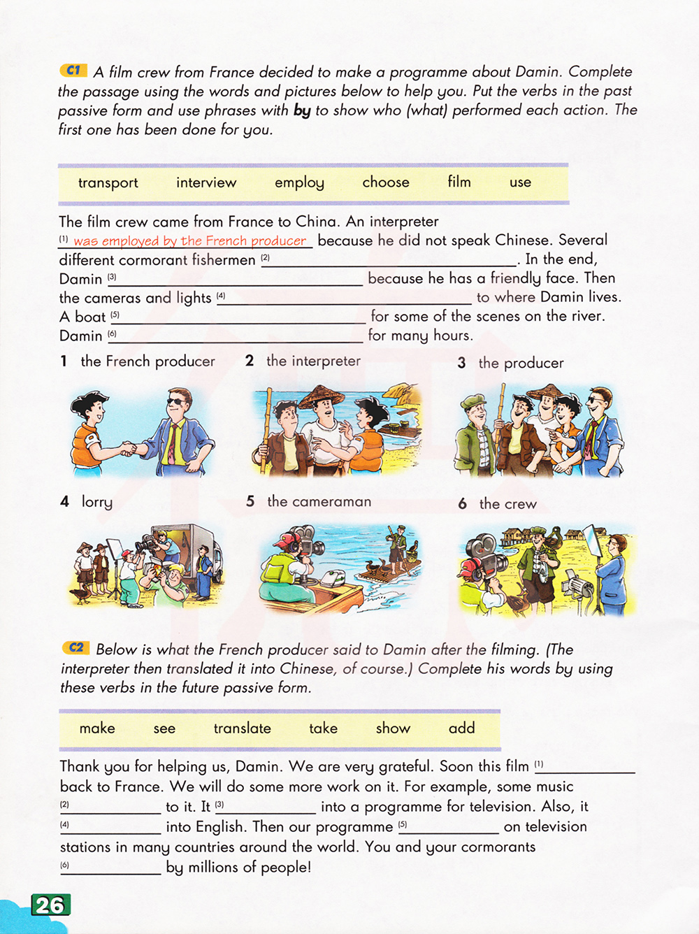 下面是电影制作完后法国制片人跟大民说的话。(当然翻译会把这些话翻译成中文。)通过使用这些动词的将来被动形式填写这段话。