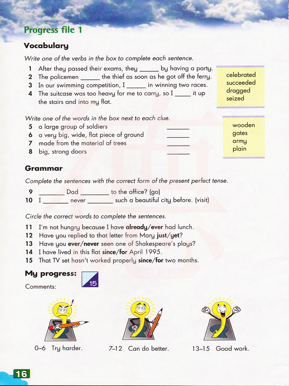 你看过莎士比亚的戏剧吗? 自从1995年4月以来我一直住在我的这套公寓里。 那台电视机两个月来一直不能正常工作。