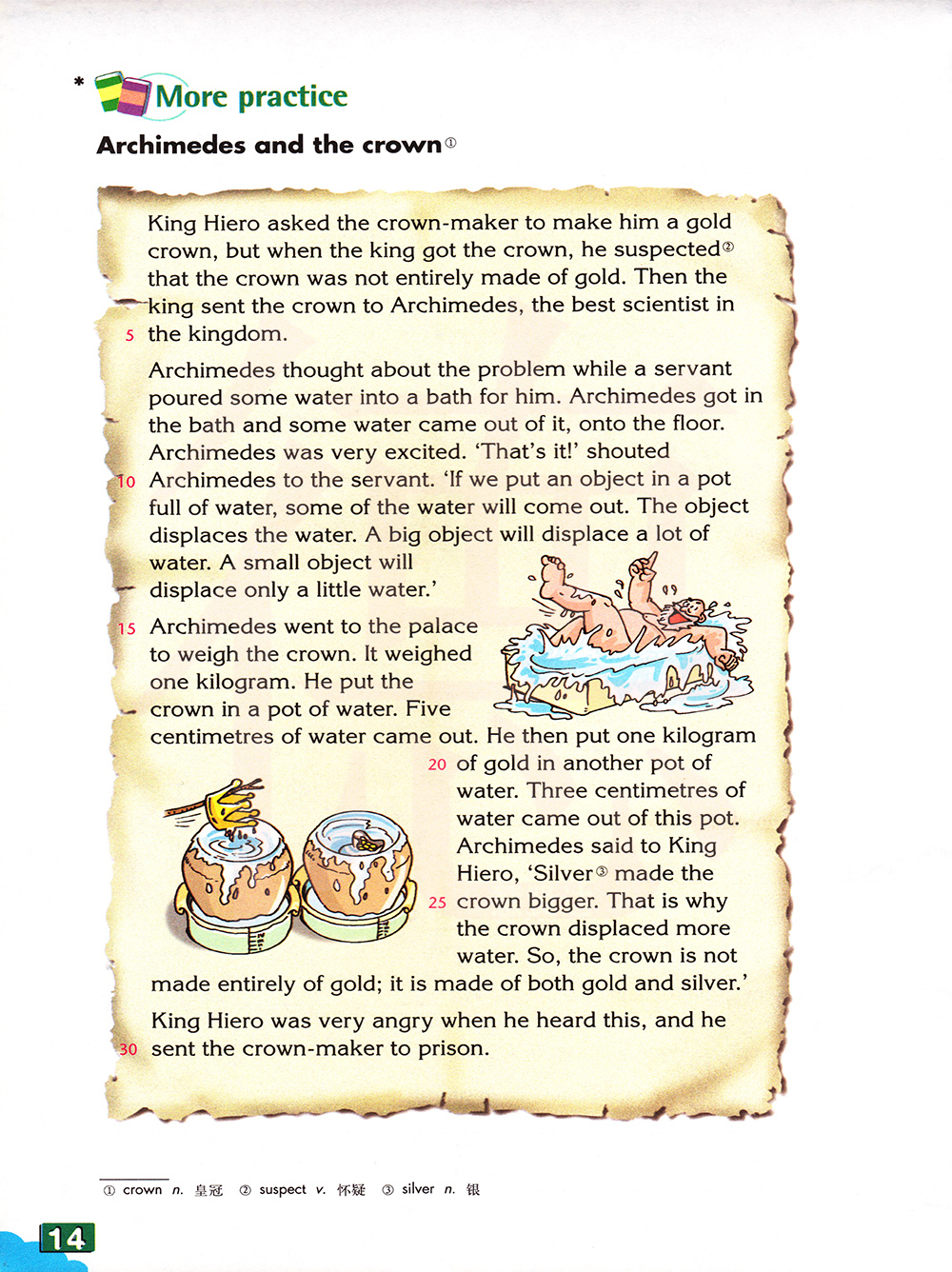 国王耶罗叫制作王冠的人为他做一顶金制的王冠,但是当国王拿到王冠的时候,他怀疑王冠不是全部由金子做的,于是国王把王冠送到了阿基米德那里,阿基米德是最优秀的科学家。