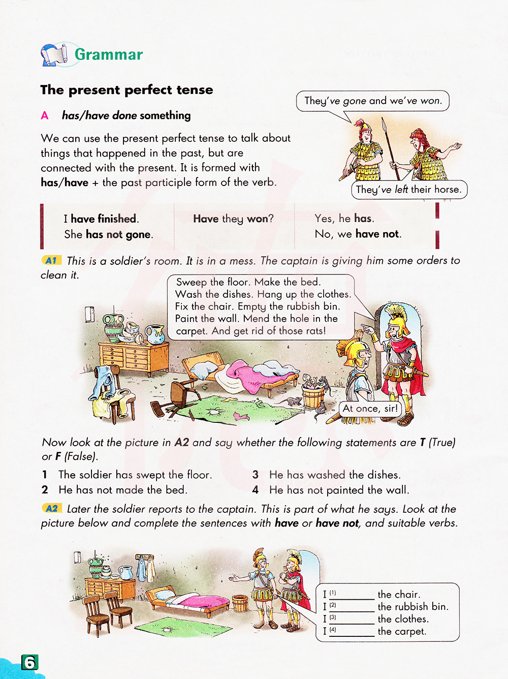 1士兵扫地了。 2 他没有铺床。