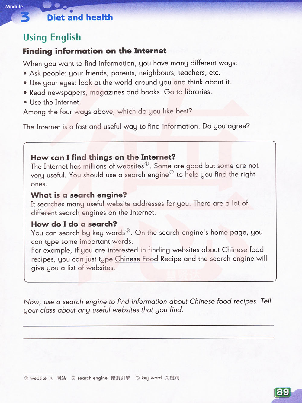 现在,使用搜索引擎来查找关于中国食物菜谱的信息。告诉你的班级你发现的任何有用的网站。