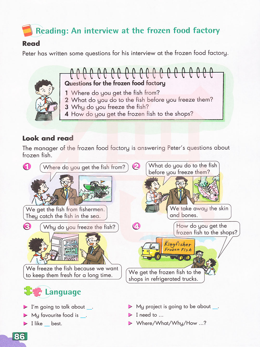 冷冻食品厂的经理正在回答彼得关于冷冻鱼的问题